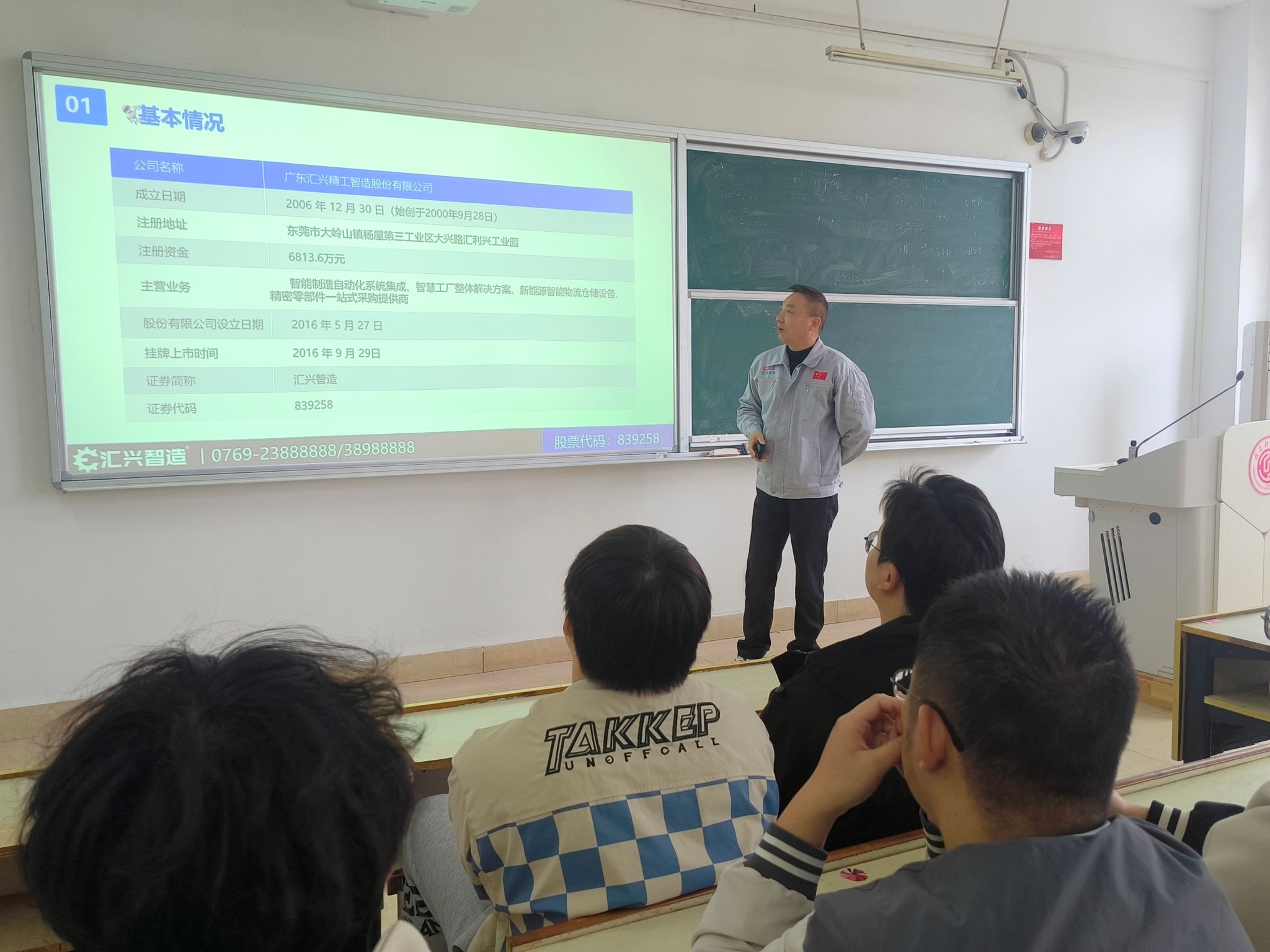 宣讲会上,江西汇兴智能装备有限公司的宣讲人金义兵先生详细介绍了公司的发展概况、企业文化、业务领域以及未来发展规划。广东汇兴精工智造股份有限公司,称汇兴智造。2000年始创于广东东莞,是一家集智能装备设计、研发、制造、营销为一体的国内高新技术。2016年,公司挂牌“新三板”,2017年,公司进入“新三板创新层”受尊敬的企业、建受尊敬的平台”的企业使命,践行“创于手、精于工、智于器、匠于心、品于行”的工匠精神。