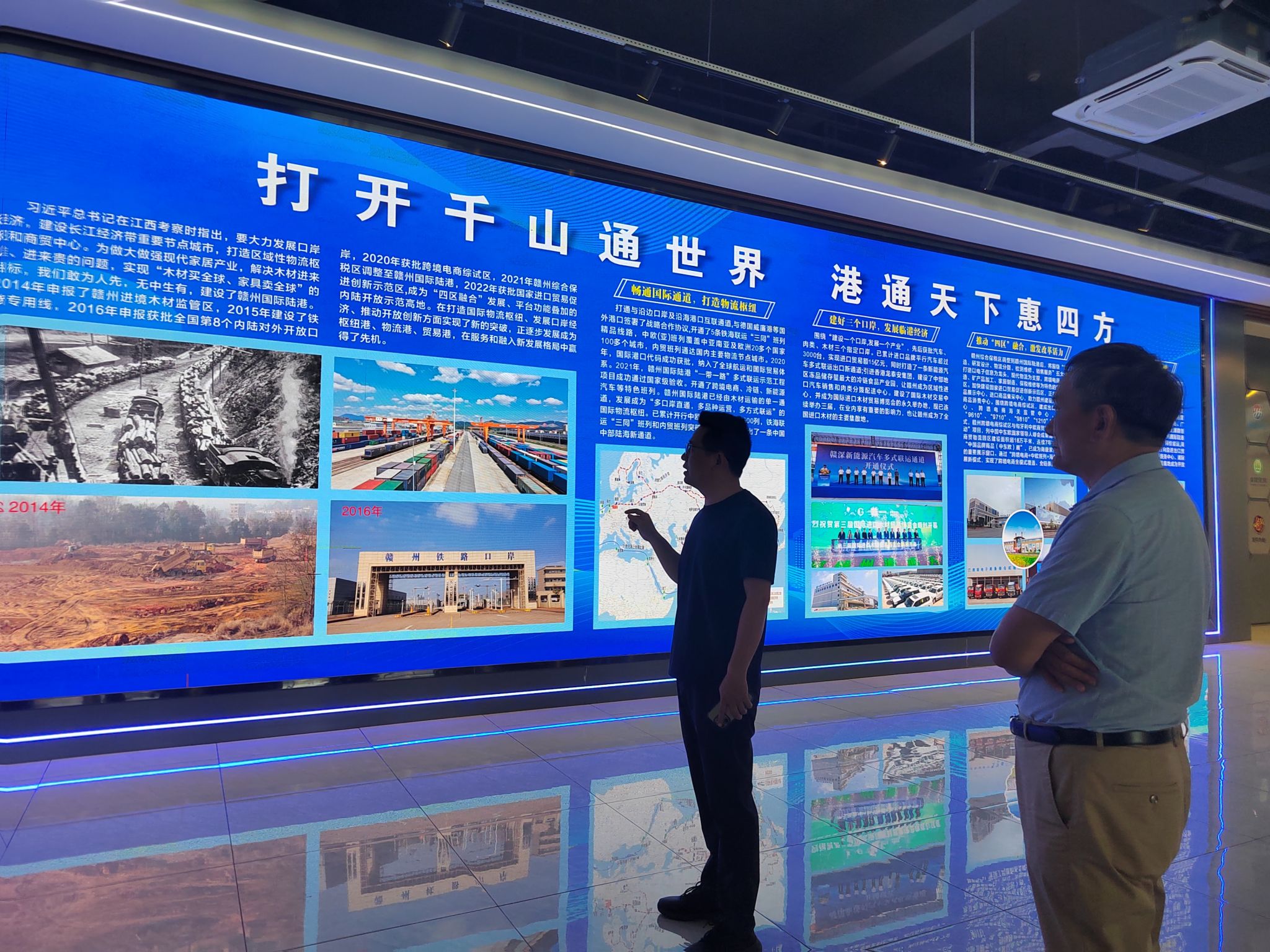 刘立平带领众人前往赣州港展厅参观,详细介绍了赣州港的发展历程、业务范畴、运营情况等。