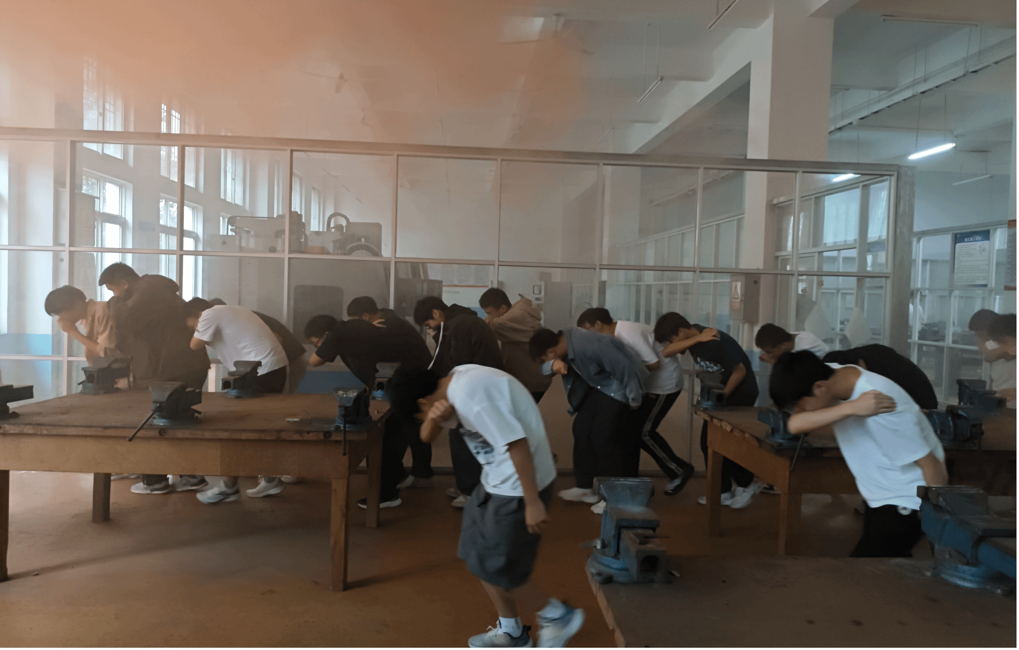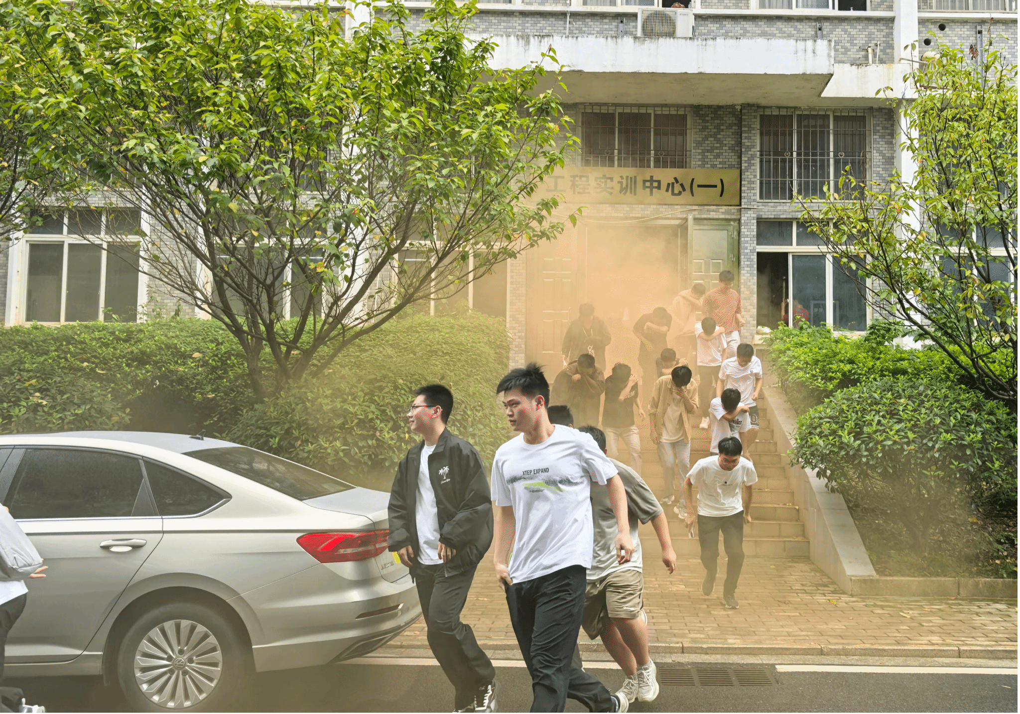15时30分,应急疏散演练开始,烟雾弹喷出橙色烟雾,师生迅速按照演练方案有序列队,按照既定路线快速、安全的撤离出工程楼到达紧急避险场所,并清点在场人数,确保每一名师生都安全脱险。