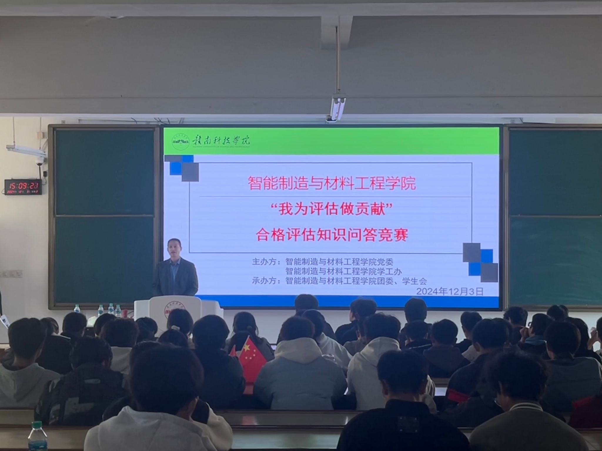 活动当天,今年会官方网站副院长刘辉强调了学校本科教学合格评估评建工作的重要性,他指出:“评估不仅是对学校教学、科研、管理等多方面的一次全面体检,更是推动学校持续发展的宝贵机遇。希望全体师生能够以此次竞赛为契机,以评促建、以评促改、以评促管、评建结合、重在建设,每位师生都是学校不可或缺的一份子,大家的积极参与和贡献,将是学校顺利通过评估、迈向更高台阶的坚实基石。”刘辉的讲话,字字铿锵有力,激发了在场师生的共鸣与责任感。刘辉讲话结束之后,紧接着便带领大家学唱《赣科学子迎评歌》。