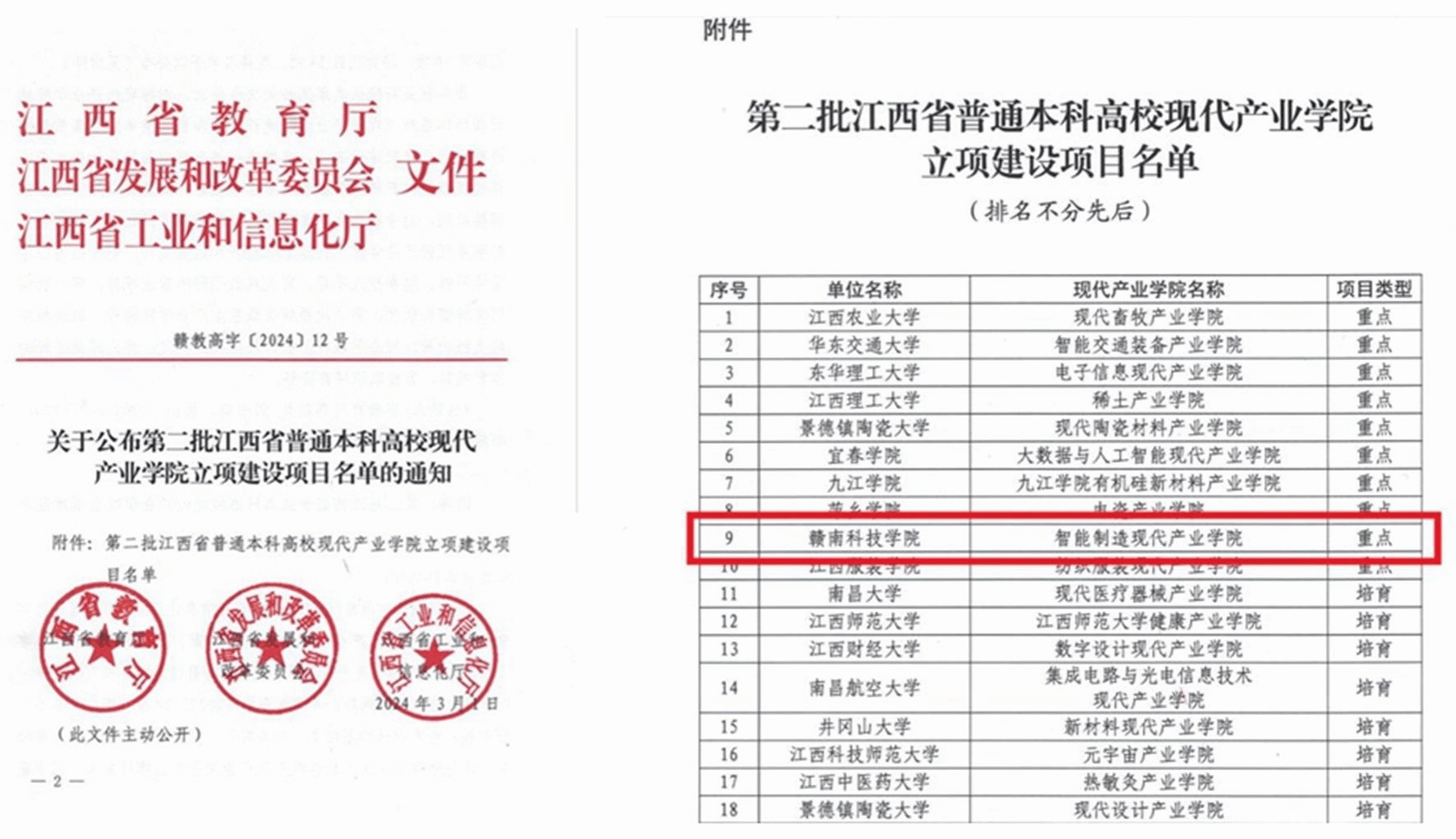 江西省教育厅、江西省发展和改革委员会、江西省工业和信息化厅联合印发《关于公布第二批江西省普通本科高校现代产业学院立项建设项目名单的通知》(赣教高字〔2024〕12号),此次全省共立项重点项目10项、培育项目14项。智能制造现代产业学院荣获省级重点项目。实现了省级现代产业学院零的突破。