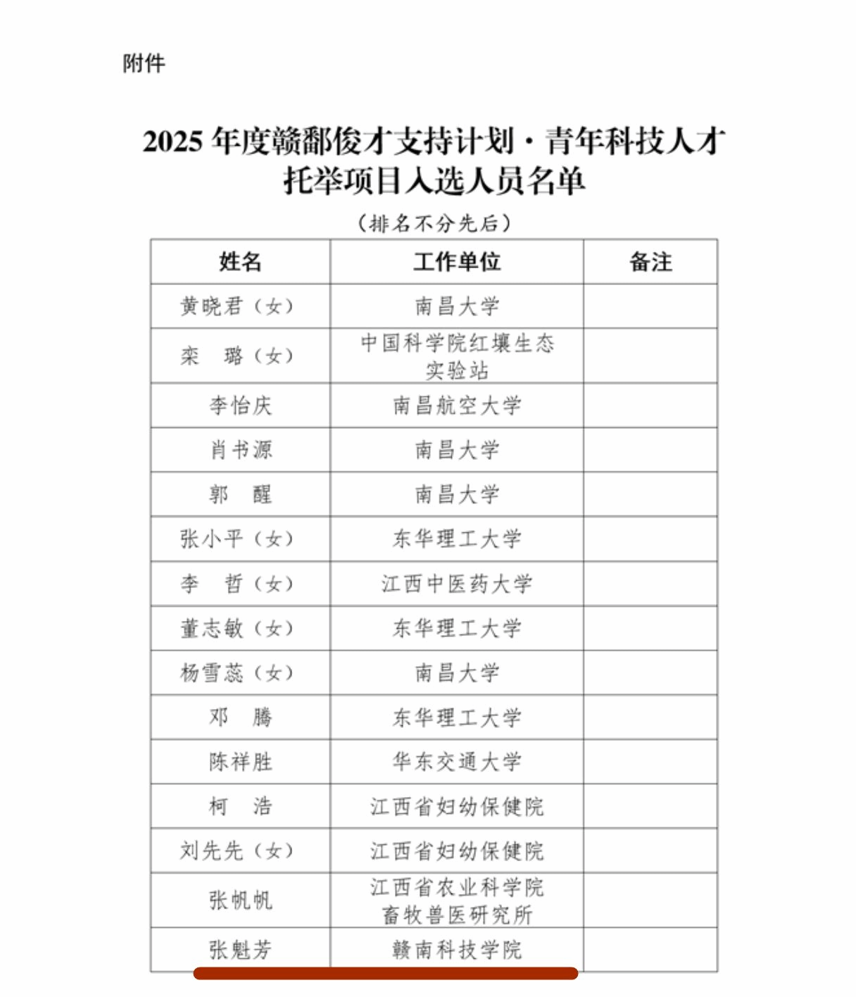 张魁芳博士成功入选江西省科学技术协会公布的2025年度赣鄱俊才支持计划·青年科技人才托举项目,成为全省15名入选者之一,标志着在培养青年科技人才方面取得了又一重要突破。赣鄱俊才支持计划·青年科技人才托举项目是江西省为培养和支持青年科技人才而设立的重要计划。学校近年来高度重视人才引进,着力培养青年科技人才。