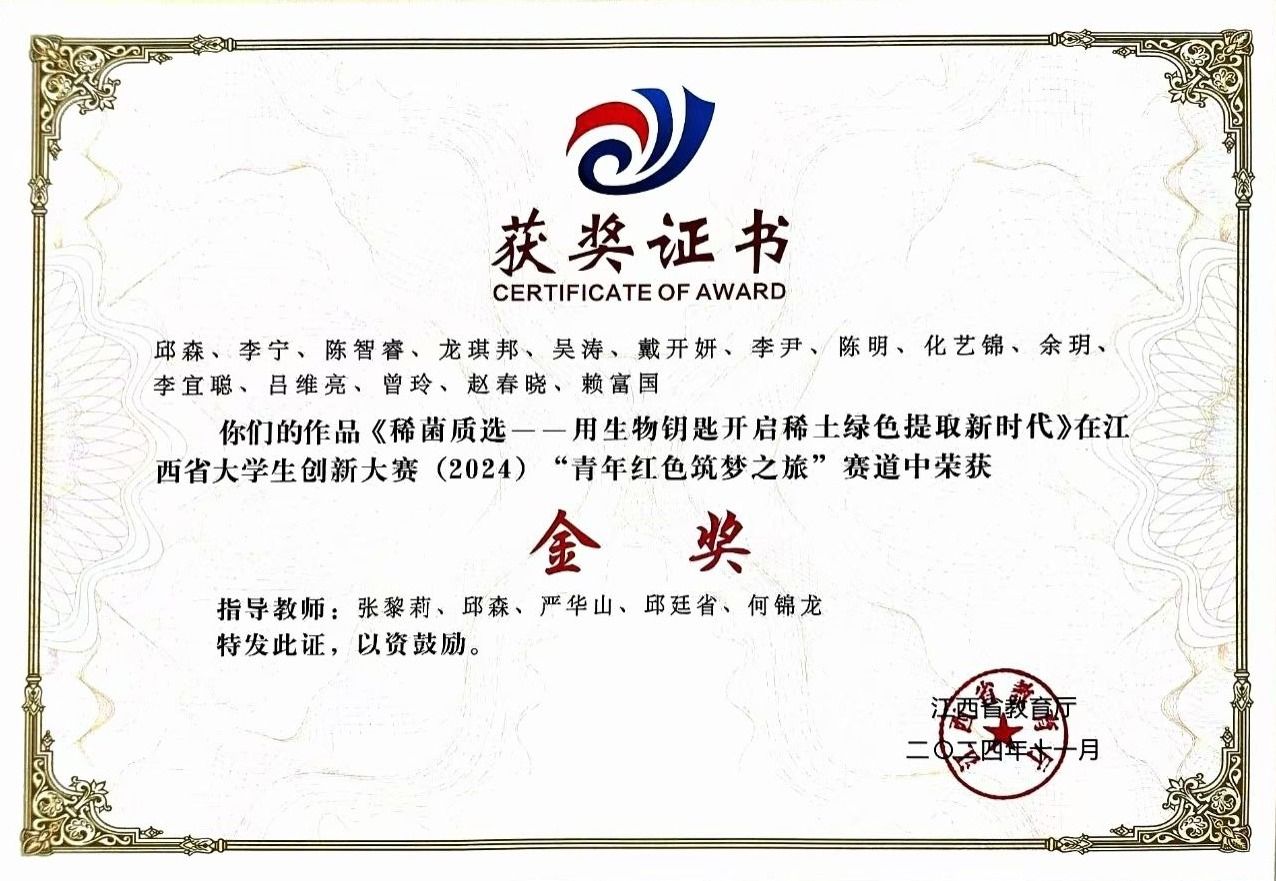 尤为突出的是:在中国机器人大赛暨RoboCup机器人世界杯中国赛中荣获国赛一等奖2项,二等奖1项,三等奖2项,其中,自动分拣项目获得全国亚军,取得了在该项赛事中的历史最佳成绩;在中国国际大学生创新大赛(2024)总决赛中,“稀菌质选——用生物钥匙开启稀土绿色提取新时代”项目取得历史性突破,斩获红旅赛道创意组国家银奖。