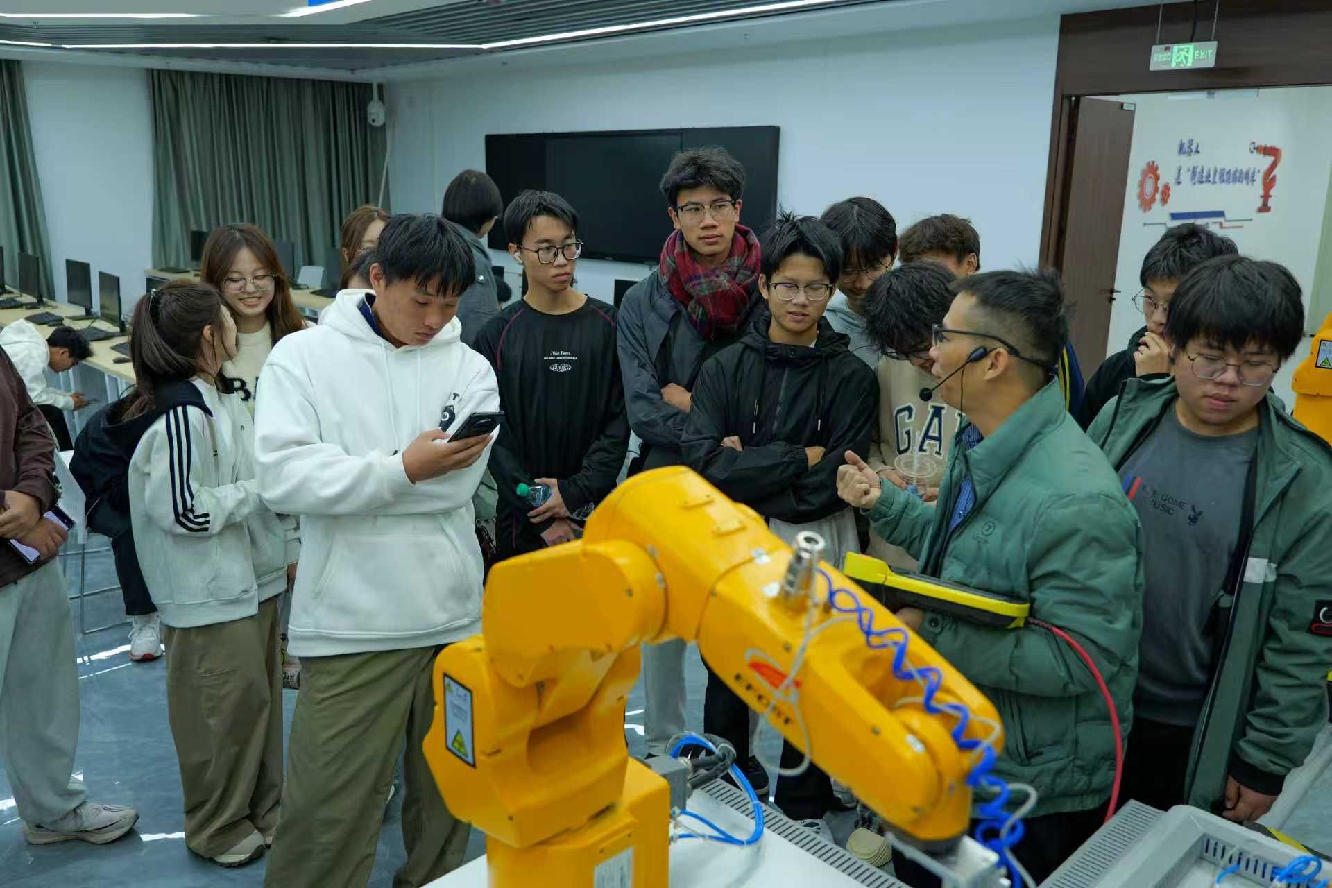 在互动环节中,张老师现场指导同学们上手体验工业机器人的编程与调试。王同学在老师的点拨下,成功让机器人“舞动”起来,一段由他亲自编写的运动程序被精准执行。他兴奋地表示:“这次实操让我深刻体会到,工业机器人编程不仅是代码的编写,更是机械原理与运动控制知识的融合,让我对智能制造的认识从概念走向了实践。”