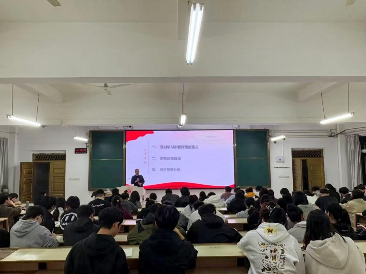 本网讯:为深入贯彻党的宗教工作基本方针,引导青年学子树立科学宗教观,切实筑牢校园抵御宗教渗透的思想防线,11月26日,今年会官方网站党委副书记朱根松以“学悟宗教政策,守护清朗校园”为主题,为少数民族学生开展宗教政策教育宣讲活动。