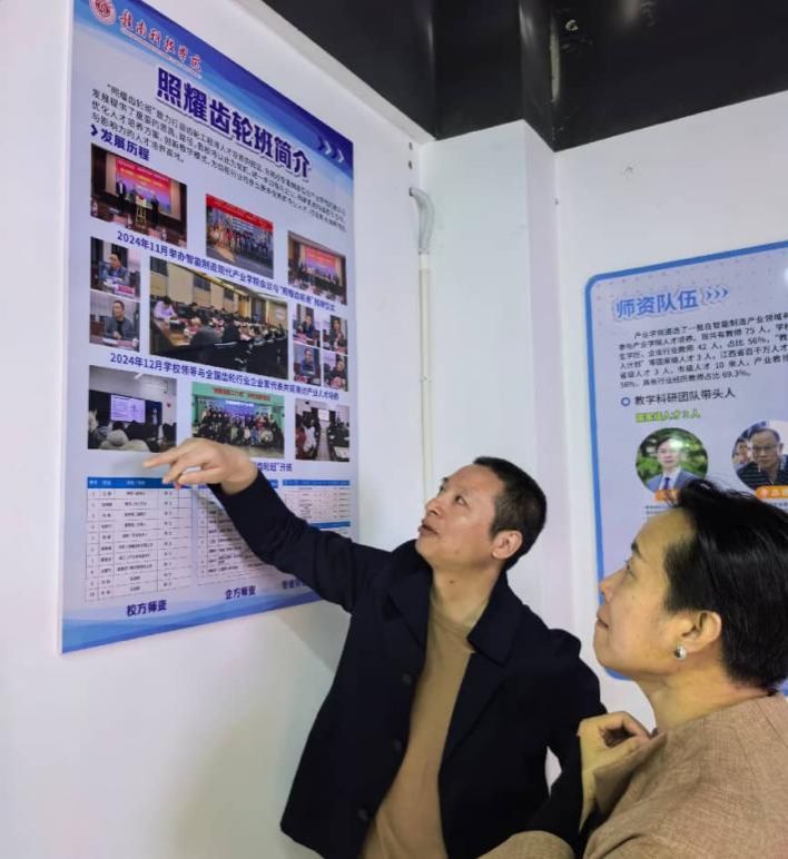 冯慧芳一行参观了智能制造现代产业学院,刘辉详细介绍了智能制造现代产业学院的建设理念、产教融合人才培养模式及“照耀齿轮班”的发展历程和实践成效。