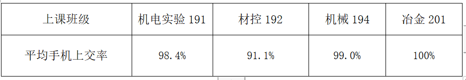 从数据来看,冶金201班同学手机上交率较高,表现良好,希望能够
