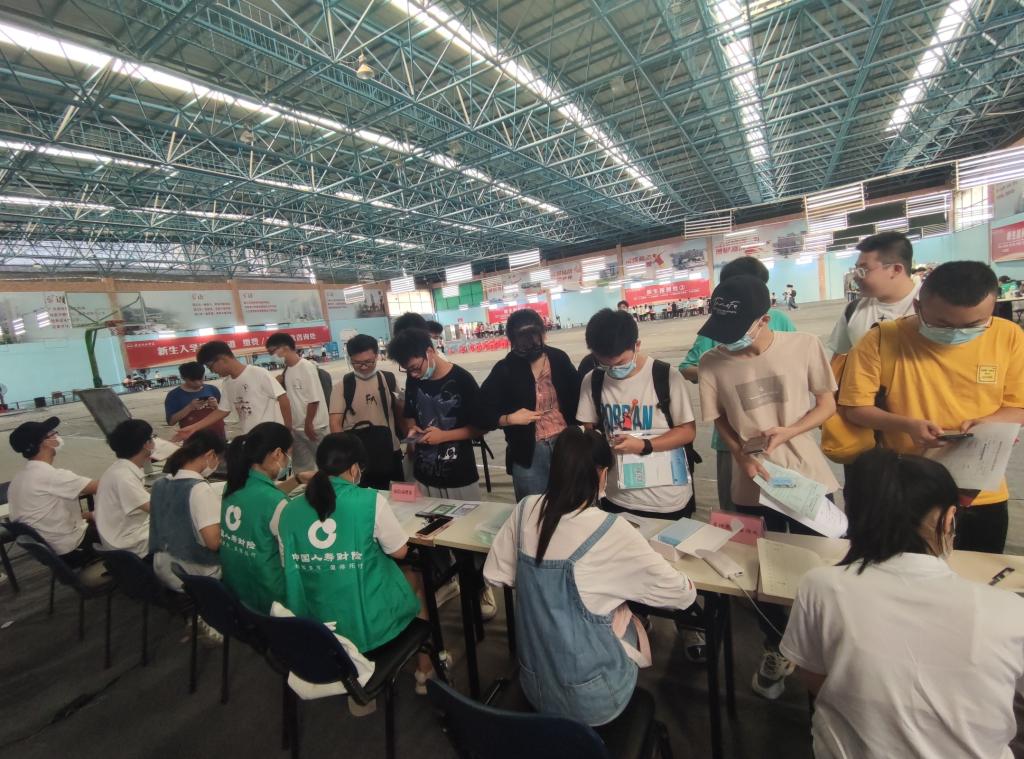 新生报到处的工作人员正在给新生注册,办理入住手续。