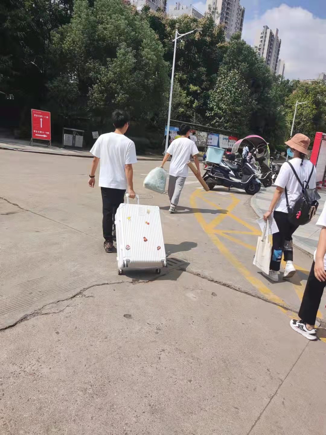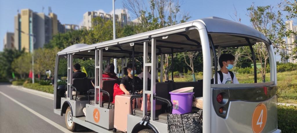 为方便新生到校报到,派出校车接送新生,校内设有摆渡车运送行李,还有志愿者帮新生扛重物,解决了家长担心孩子提不动行李的后顾之忧。