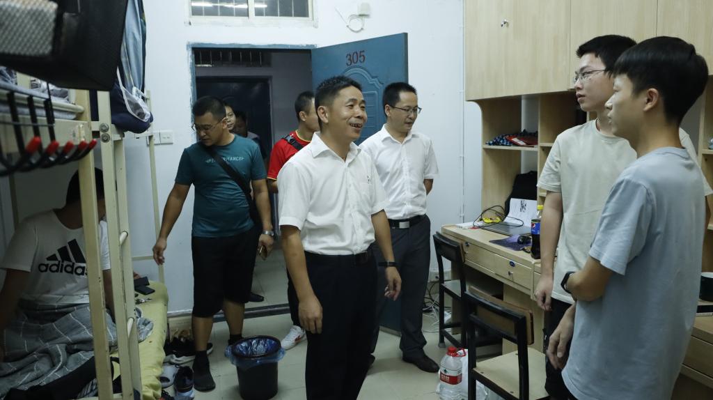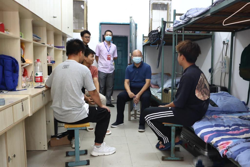 “来自哪里”“学校饭菜是否可口”“是否能够适应气候”“大家如果遇到什么问题或困难,可以及时给学校老师反映。”9月19日晚,校过渡期管委会常务副主任何锦龙一行来到2栋学生宿舍及女生宿舍,与同学们亲切交谈,了解学生的家乡、家庭情况和专业、入校感受等。何锦龙仔细查看了宿舍生活环境,详细查看了楼栋宿舍管理文化,调研了宿舍安全及卫生状况,了解了学生思想动态,指导了宿舍安全教育工作。何锦龙希望同学们能够理解疫情常态化情况下“非必要不外出”的特殊要求,做好自身健康管理工作;勉励同学们要养成良好的生活、学习习惯,积极进取,夯实专业基础,提升综合素质,做好未来职业规划,为实现人生梦想筑牢根基。
