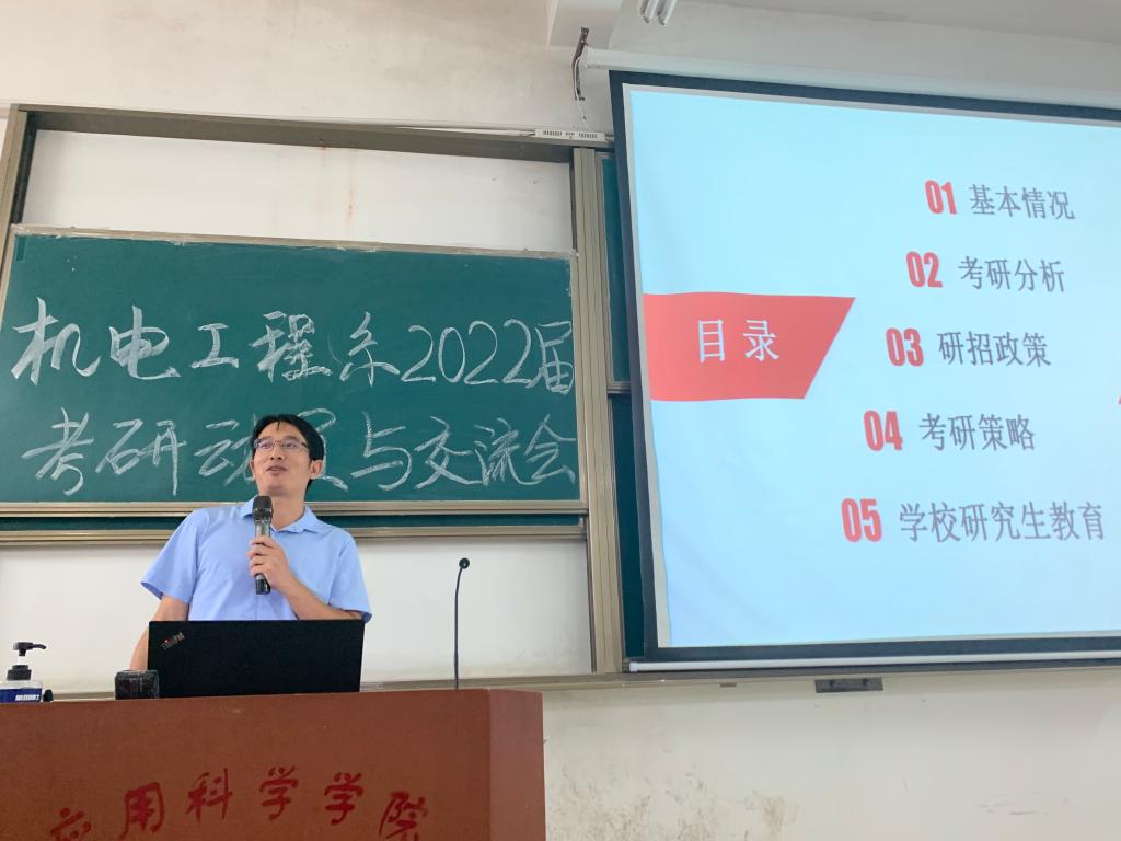 (本网讯:杨瑞)为提高人才培养质量,营造浓郁的考研氛围, 9月22日,机电工程系于主教学楼Z1D4召开2022届考研动员与交流会。会议邀请了江西理工大学研究生院副院长杨崇联、江西先进铜产业研究院副院长肖翔鹏、永磁磁浮技术与轨道交通研究院邓永芳博士进行考研指导与交流,机电工程系主任刘辉、副主任关开荣、毕业班辅导员杨瑞及2018级全体200多名考研学生参加会议,会议由系主任刘辉主持。