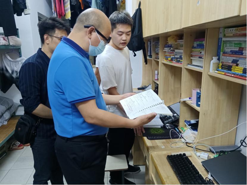 本网讯:5月12日晚,学校过渡期管委会副主任邓亦林带领学工办主任黄敬宝,机电工程系副主任肖志华和辅导员张敏,深入机电工程系学生宿舍看望学生,进一步了解疫情防控期间学生学习、生活情况。