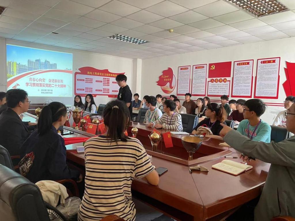 2022年11月11日,机电工程系学生会统筹开展学习二十大精神活动,各部门负责人悉数到场,在本院团委张敏老师的带领下,主要学习了关于高举中国特色社会主义伟大旗帜,坚持马克思列宁主义、毛泽东思想、邓小平理论、“三个代表”重要思想、科学发展观,全面贯彻习近平新时代中国特色社会主义思想,分析了国际国内形势,党的二十大主题的提出等方面。张敏老师带领机电工程系团总支干部一起回顾我党在过去5年的工作和新时代10年的伟大变革。