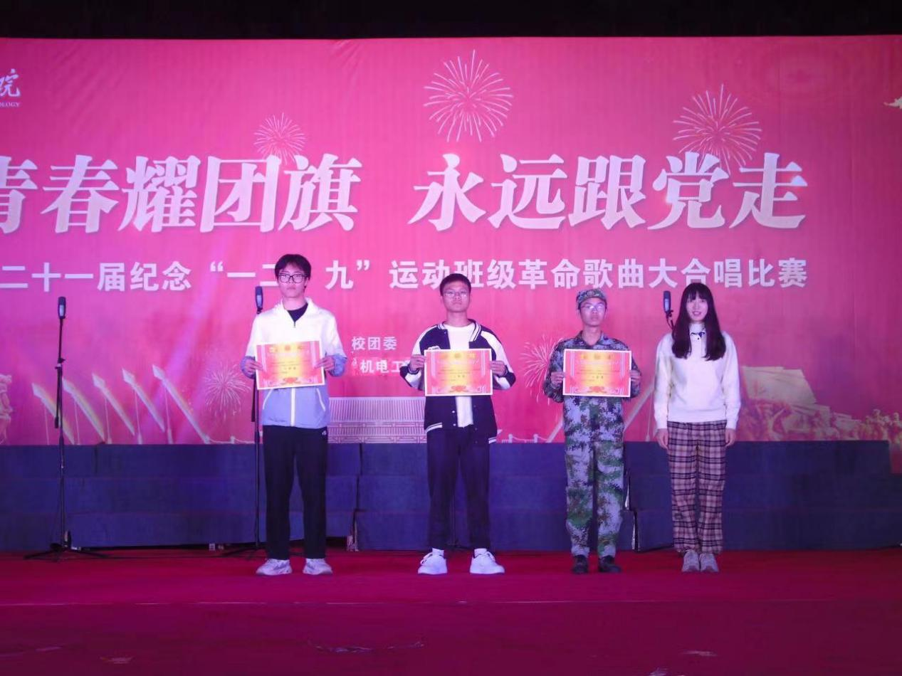 经过一系列的角逐,冶金212班和机电201班以优异的成绩荣获一等奖,冶金201班、机械213班和机械214班荣获二等奖,材控201班、冶金202班、电气202班、机电202班和机器人211班荣获三等奖。其中,机器人211班崔馨月同学荣获“最佳指挥”称号,电气203班陈文轩同学荣获“最佳领唱”称号,机器人211班张凤婷同学荣获“最佳朗诵”称号。