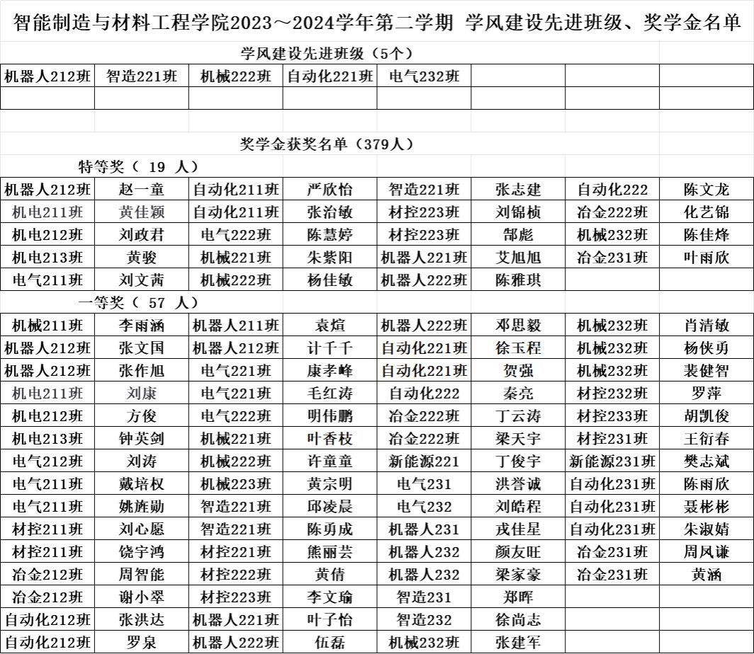 根据学校关于做好2023-2024学年第二学期学生综合素质测评及学生综合奖学金评定工作的通知》文件要求按照《今年会官方网站学生综合素质测评评定补充细则》有关规定,经学生本人申请班级认定评议小组评议、学院认定评审领导小组审定拟确定机器人212等5个班级获得学风建设先进班级称号,赵一童等379名学生获得综合奖学金。现予以公示,公示期为:20241022日到1024,公示天。如有异议,请在公示期内与学院反映。
