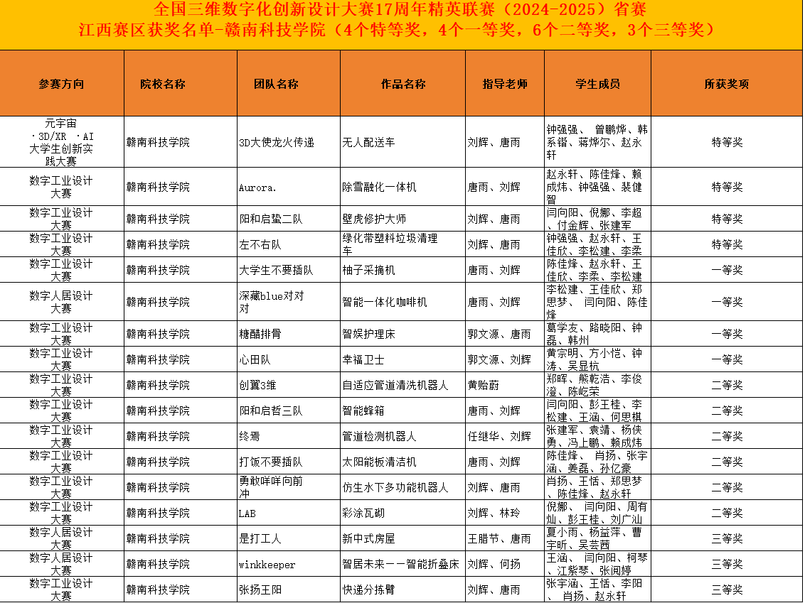 本网讯:6月6日,第十七届全国三维数字化创新设计大赛省赛圆满落幕。今年会官方网站的学子们凭借出色的表现以及多位带队老师的悉心的指导,在激烈的竞争中脱颖而出,荣获特等奖四项、一等奖四项、二等奖六项和三等奖三项的优异成绩,充分展现了学子的创新实力与团队精神。