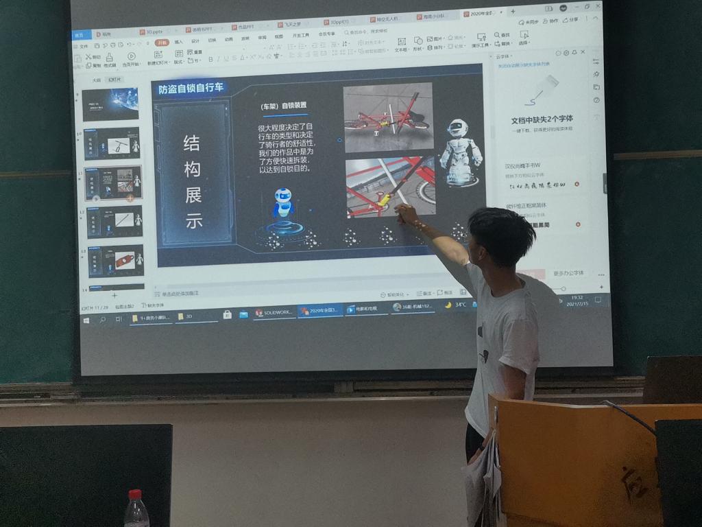 7月15日,2021年第十四届全国3D大赛初赛在工程研究院S401举行,来自不同专业的30多个团队共计100多人参加比赛。此次比赛由机电工程系3D动力协会承办,主要分为学生作品演示、教师提问、大赛总结三个环节,大赛邀请了机电工程系主任刘辉老师、陈闻老师和唐宏老师担任评委。