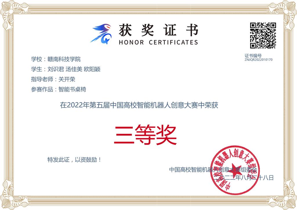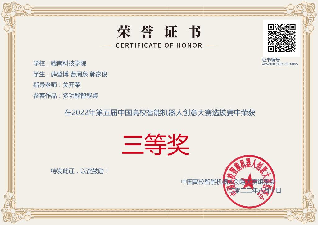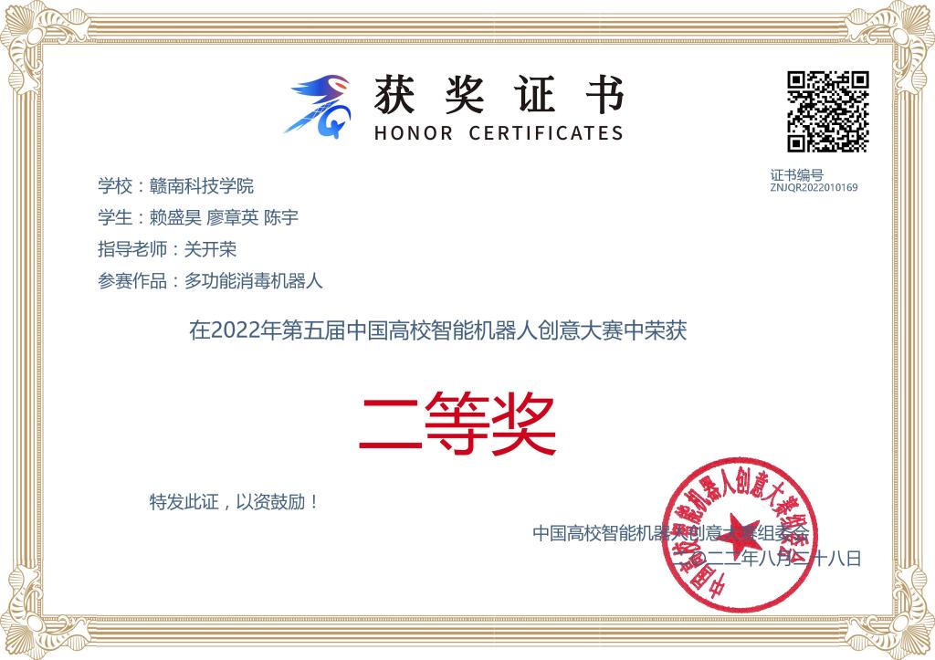 参赛作品经过区域赛选拔和总决赛,最终,4支队伍在区域赛中获奖,2支队伍在全国决赛中获奖。其中,赖盛昊、廖章英、陈宇团队设计的作品“多功能消毒机器人”获得国家二等奖,刘识君、汤佳美、欧阳颖团队设计的作品“智能书桌椅”获得国家三等奖,王桥根、邓紫嫣、吴绮雯团队设计的作品“智能天花板清扫机器人”获得选拔赛二等奖,薛登博、郭家俊、曹周泉团队设计的作品“多功能智能桌”获得选拔赛三等奖。
