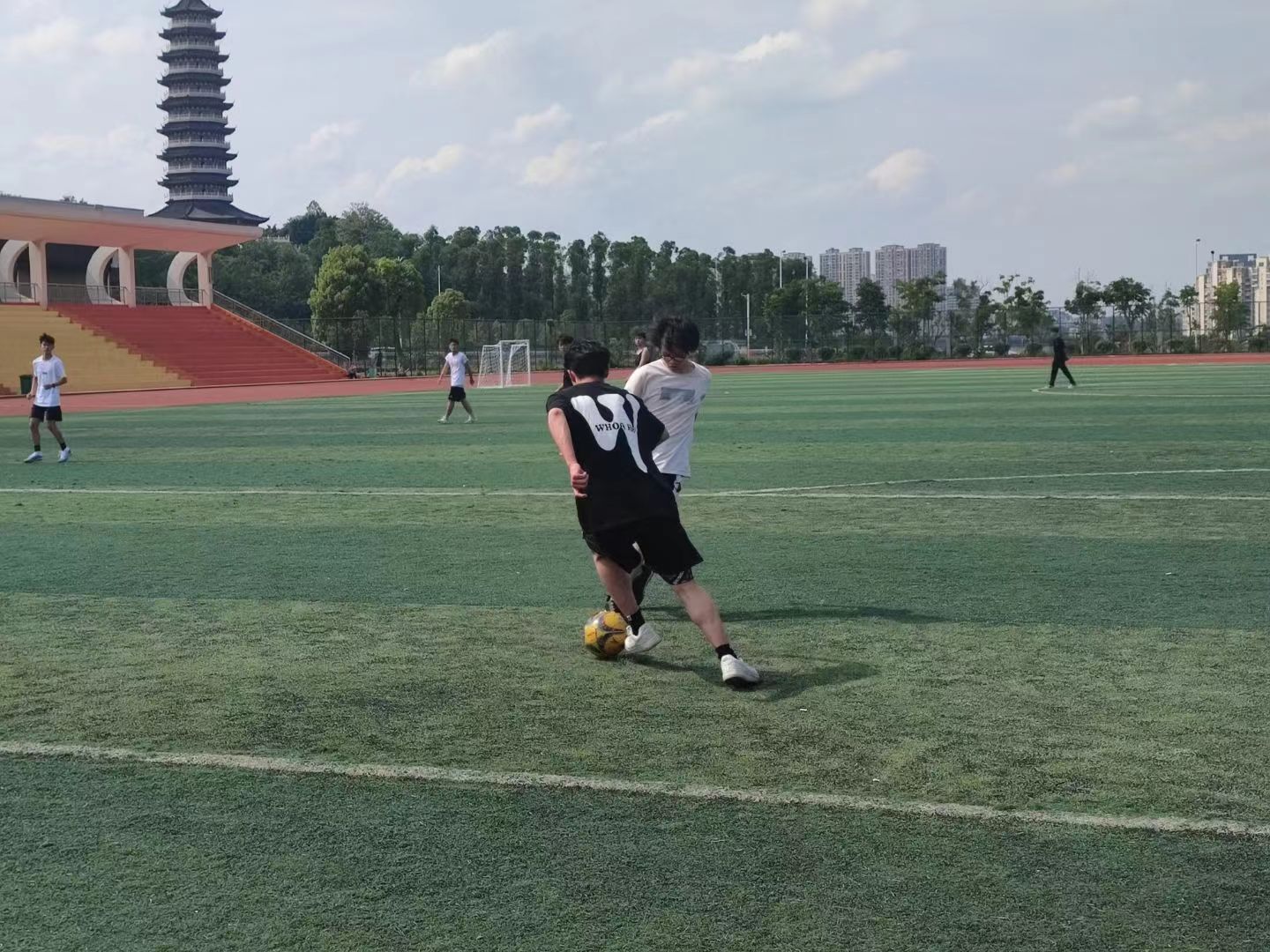 师生篮球比赛紧张激烈却不失和谐温馨,简单愉悦的比赛氛围中洋溢着青春的热情,比赛场上战火燃烧,场下观众情绪激昂、奋力呐喊,呐喊声斥着整个球场,赛场上选手们熟练地运球、传球,积极地拼抢、精准地投篮,场外的喝彩声也一浪高过一浪。双方选手奋力拼搏,努力实现更快、更强的精神品质,最后老师组以101:97胜于学生组。