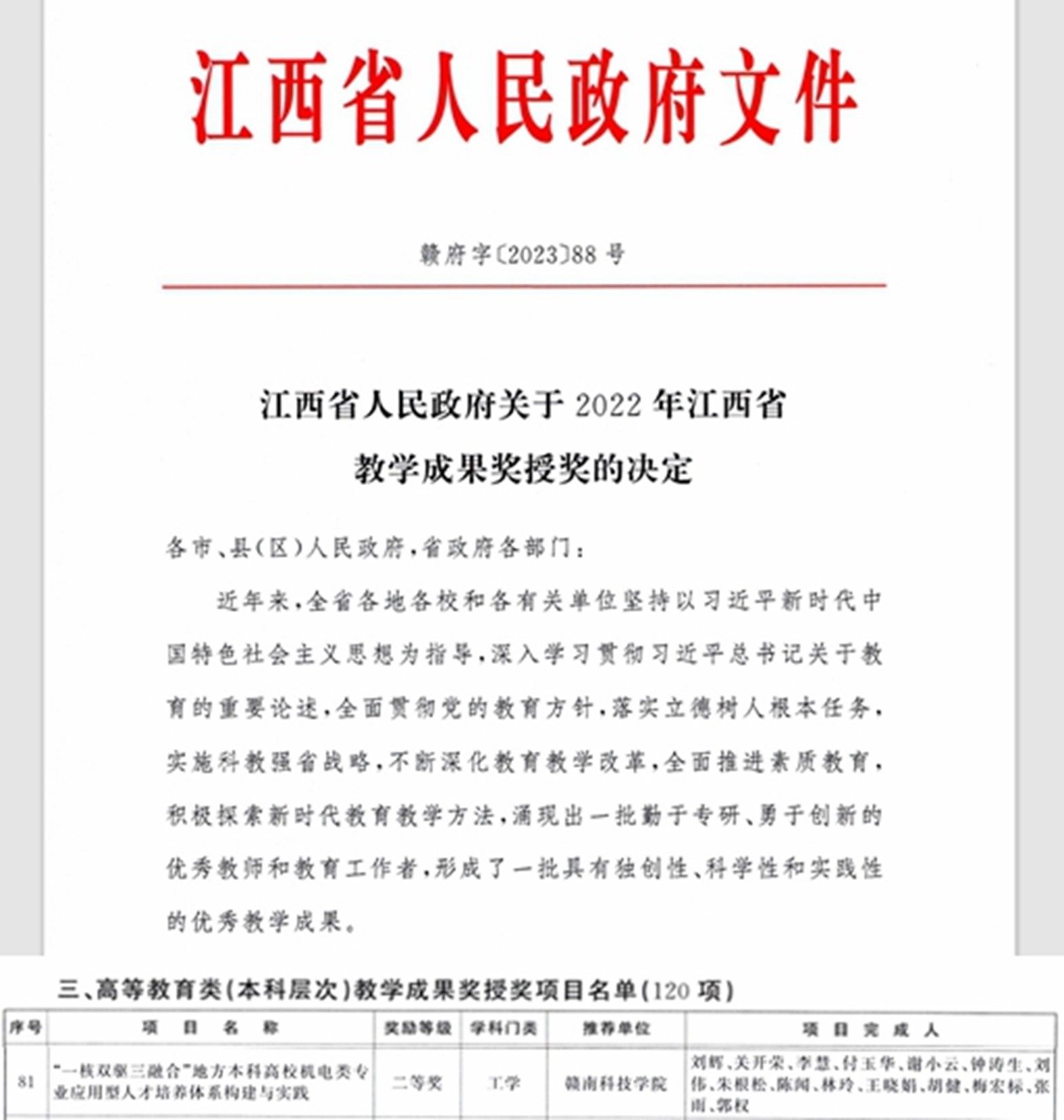 本网讯:近日,为表彰教学领域的先进典型,发挥教学成果的引领激励作用,省政府决定授予350项教学成果为2022年江西省教学成果奖。其中,《“一核双驱三融合”地方本科高校机电类专业应用型人才培养体系构建与实践》项目喜获高等教育类(本科层次)教学成果奖二等奖。