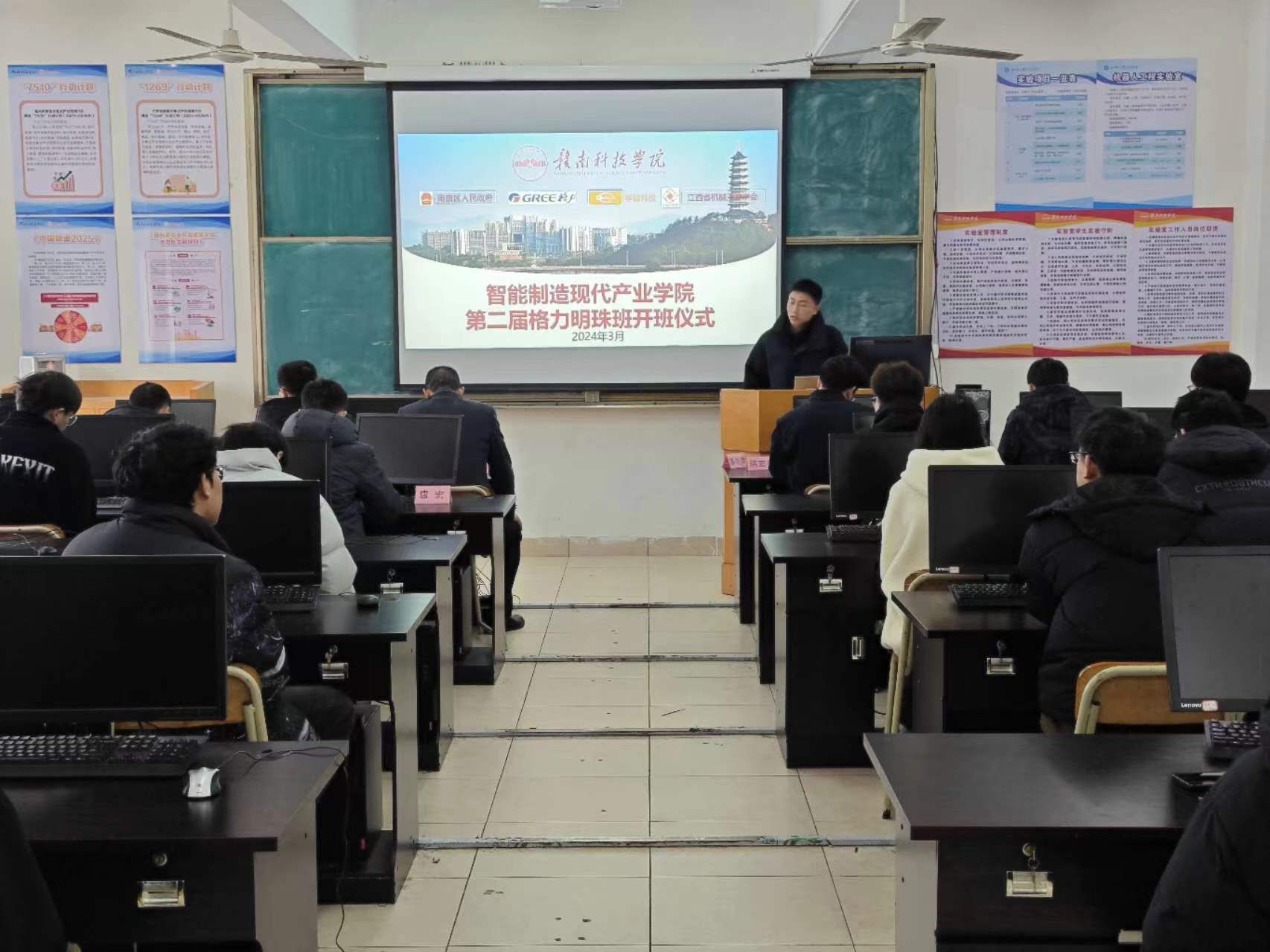 本网讯:3月4日上午,智能制造现代产业学院第二届“格力明珠班”开班仪式在工程研究院401举行。智能制造现代产业学院执行院长刘辉、副院长关开荣,格力电器(赣州)有限公司人力资源部部长洪志勇、招聘培训经理黄凯奇出席开班仪式。智能制造与机器人教研室主任唐宏、副主任冯凯,产业学院行政部负责人张雨,第二届“格力明珠班”班主任刘懿晨以及第二届“格力明珠班”全体同学参加活动。开班仪式由唐宏主持。