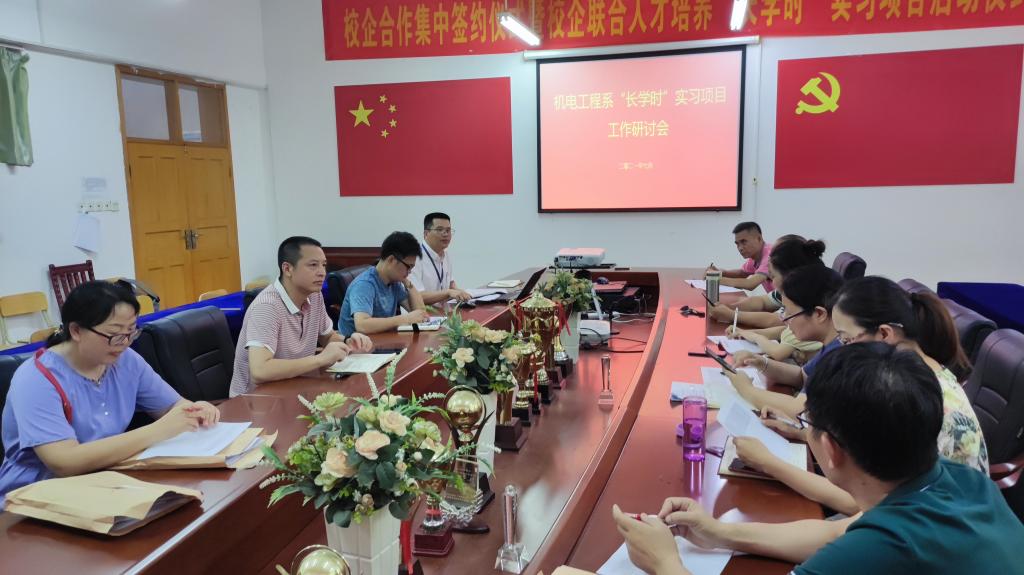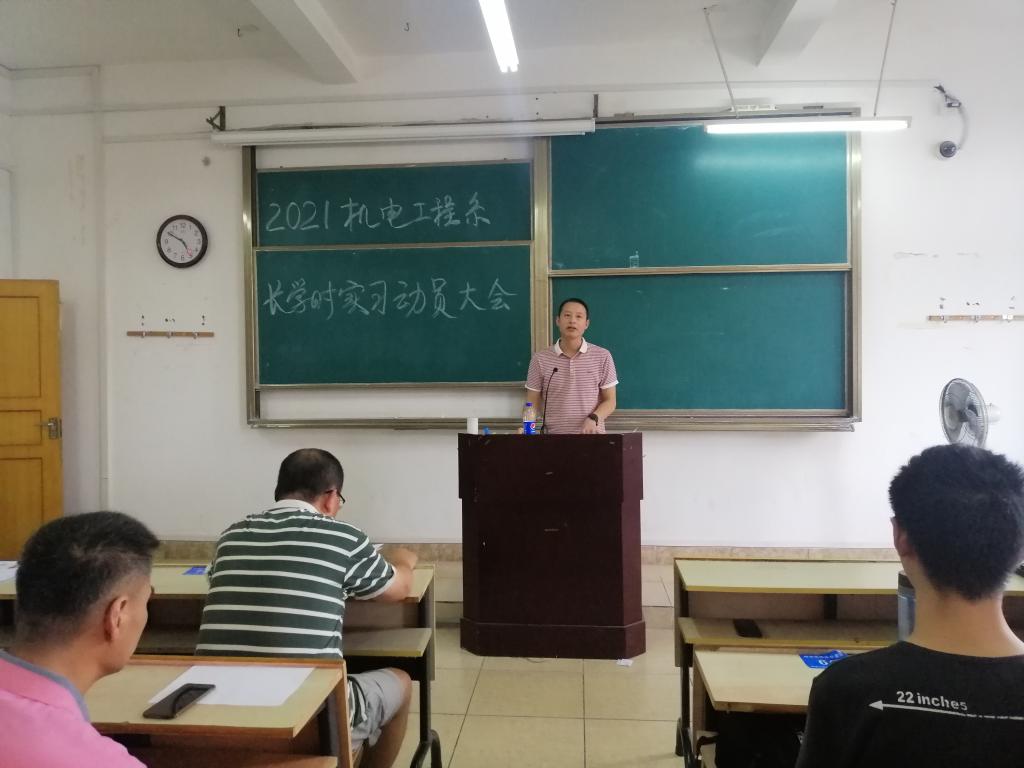7月2日下午,机电工程系部署2021年“长学时”实习项目相关工作,在教学主楼八楼机电系党员活动室召开“长学时”实习工作研讨会,并在主教102教室召开了“长学时”实习动员大会。系主任刘辉、系党总支书记朱根松、副主任关开荣与肖志华、11位带队老师和2018级80多名实习学生参加会议,会议由副主任关开荣主持。