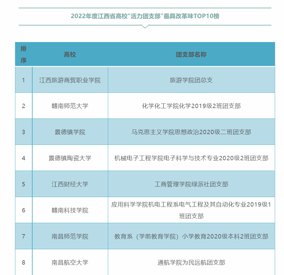 为深入贯彻“全团抓思想政治引领”“全团大抓基层”“全团抓学校”工作部署,落实《关于改革创新高校共青团工作 切实增强思想政治引领实效的若干措施》,激发高校团支部活力,促进学生社团建设管理,团省委、省学联开展了2022年度江西省高校“活力团支部”“活力社团”风采展示活动,通过新媒体展示的方式集中呈现了高校团支部、学生社团改革建设成果和典型经验。